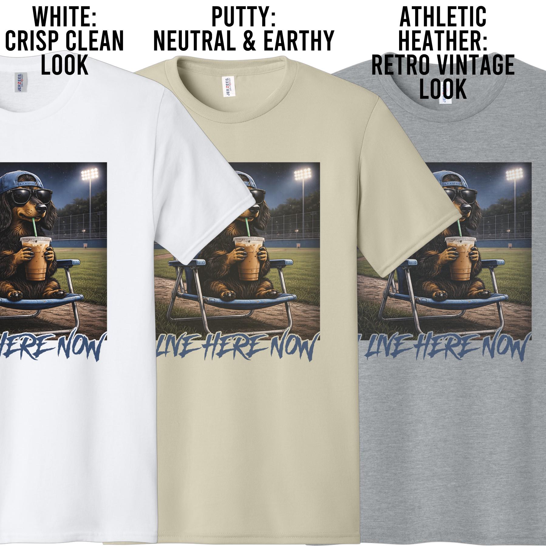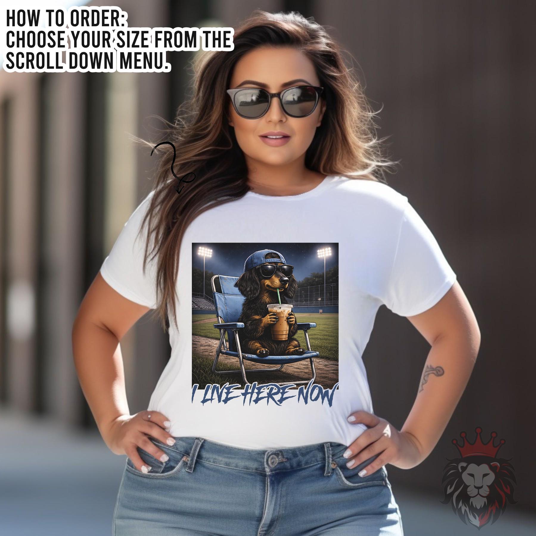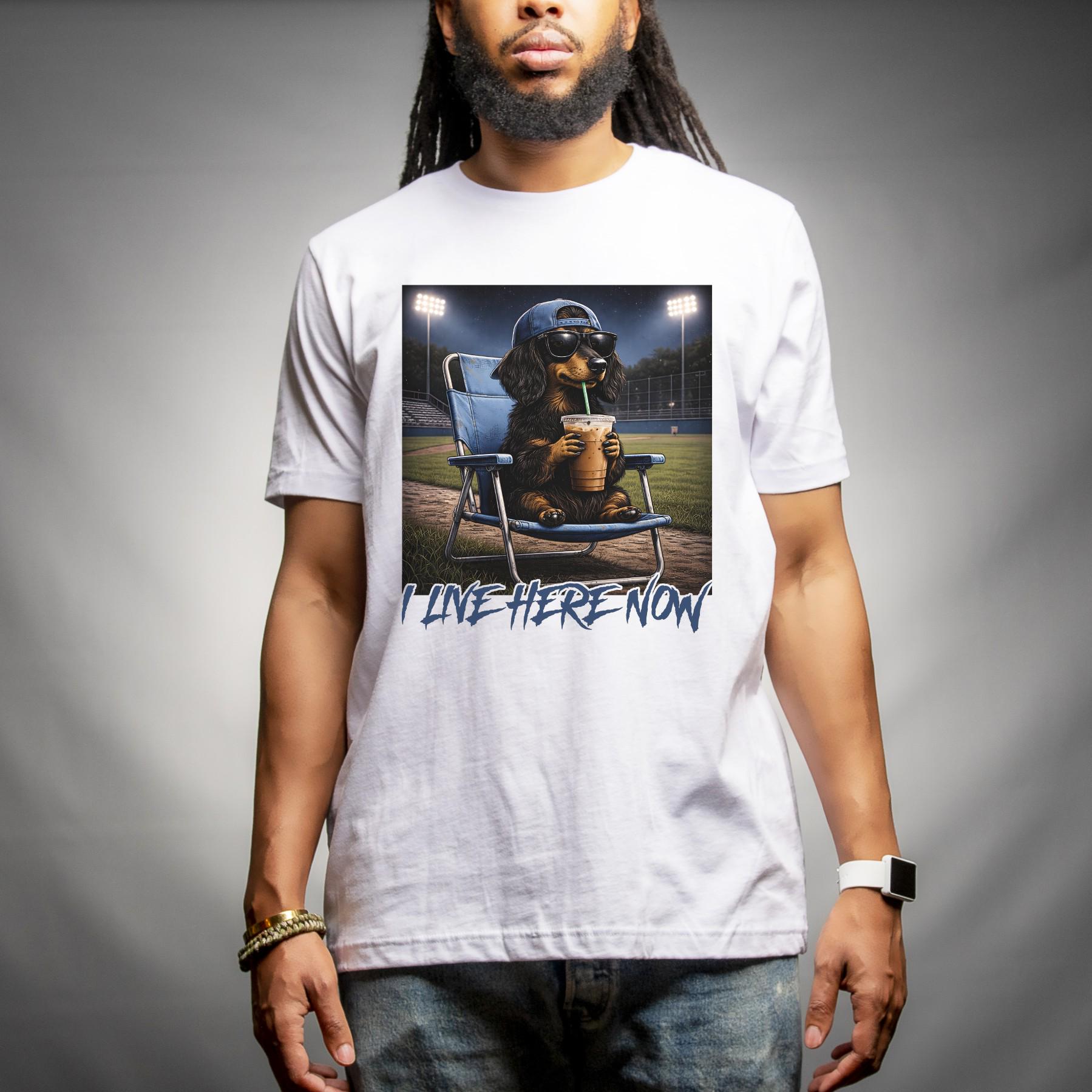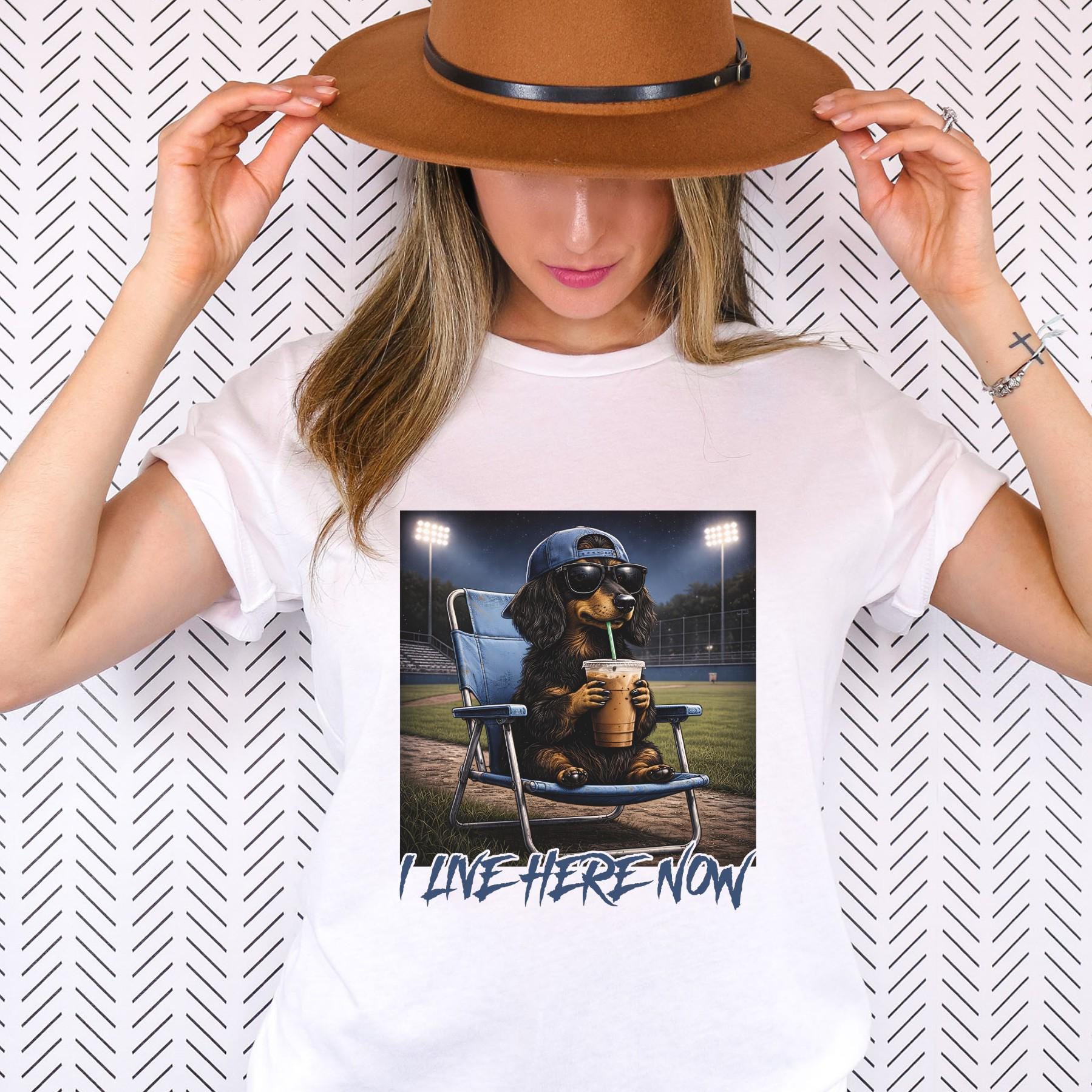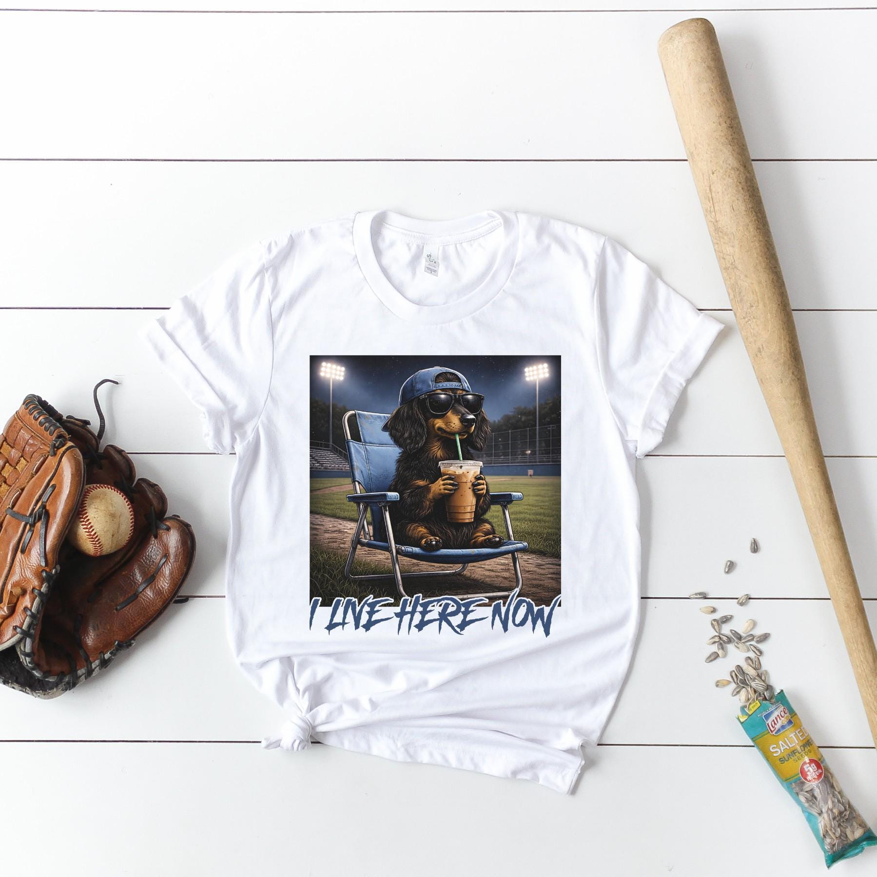 This funny “I Live Here Now” baseball shirt features a laid-back Dachshund sitting in a chair drinking iced coffee at the field and fully settled into bleacher life. It’s the perfect design for anyone who spends their weekends at the ballpark.