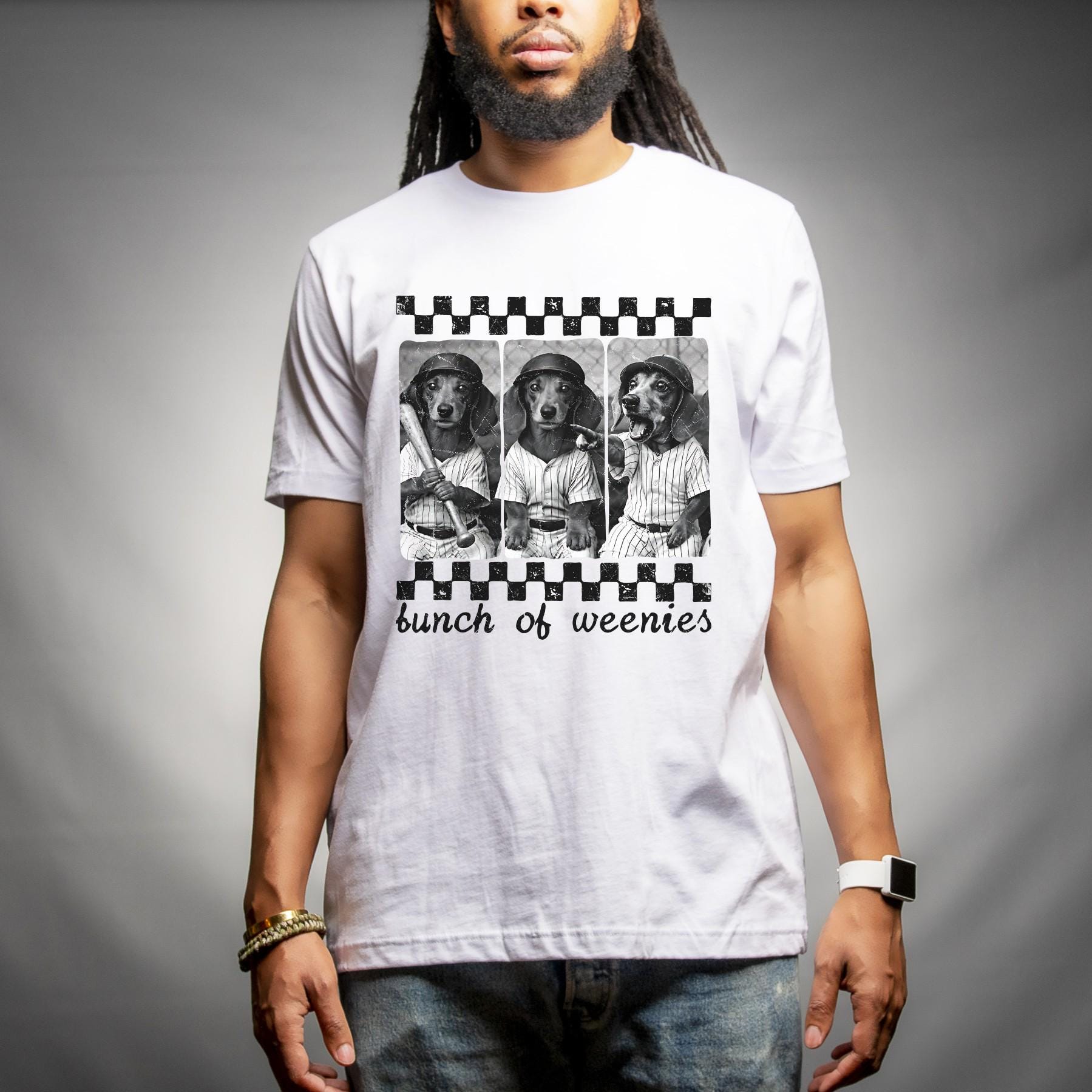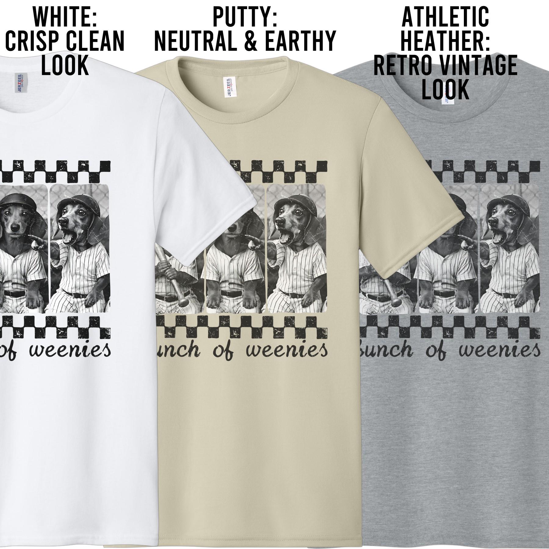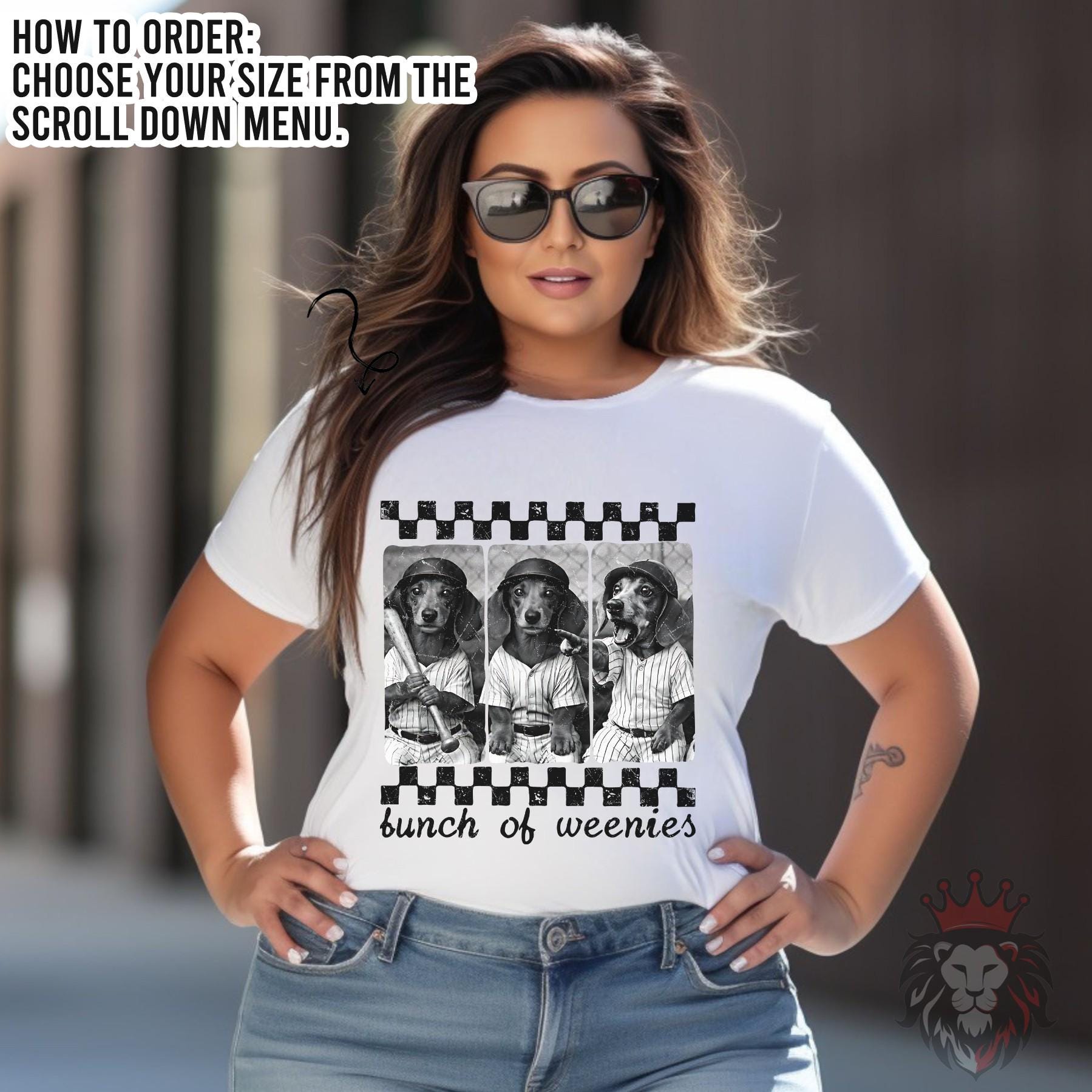 This funny “Bunch of Weenies” baseball shirt features three dachshunds dressed in vintage baseball uniforms, bringing the perfect mix of humor and sporty style. It’s a must-have for dog lovers who also live for game day.