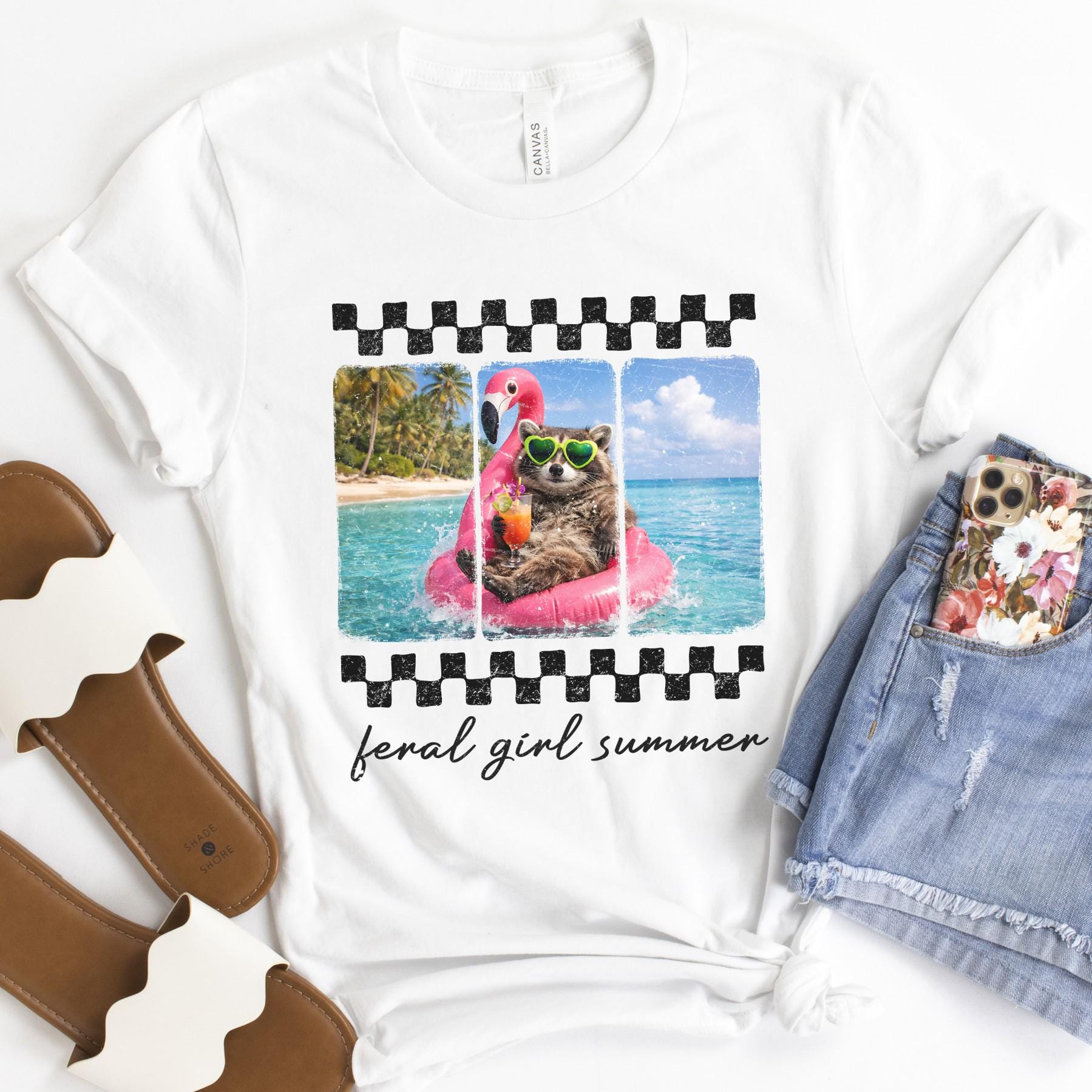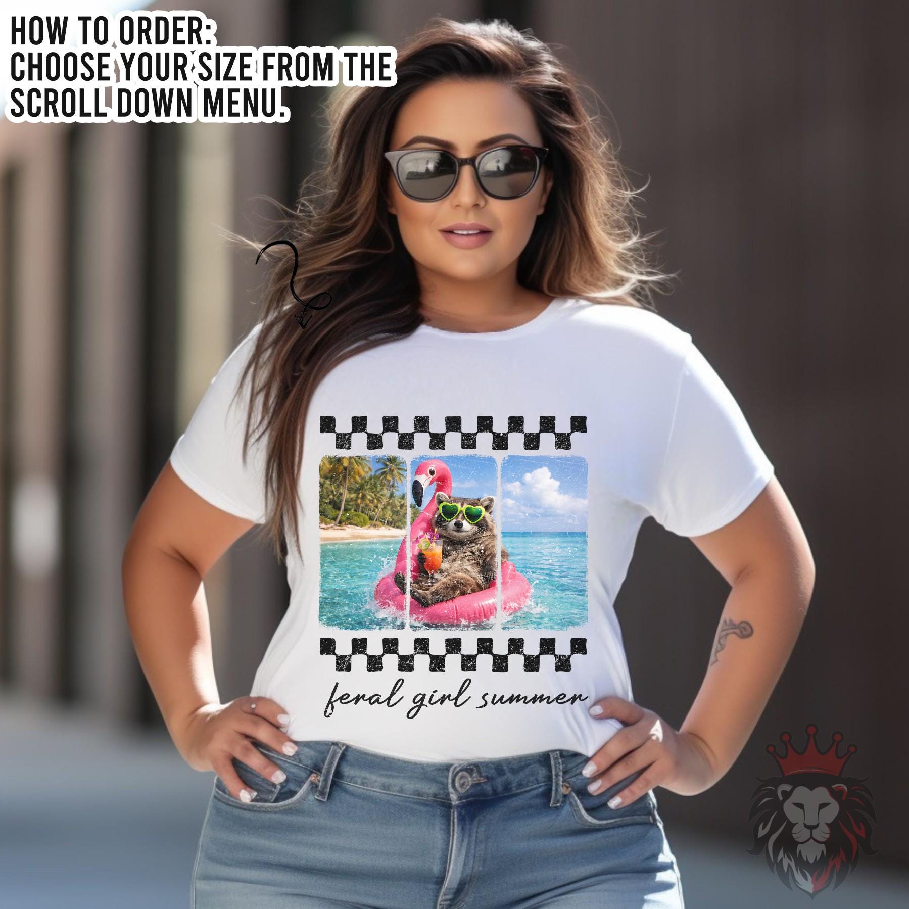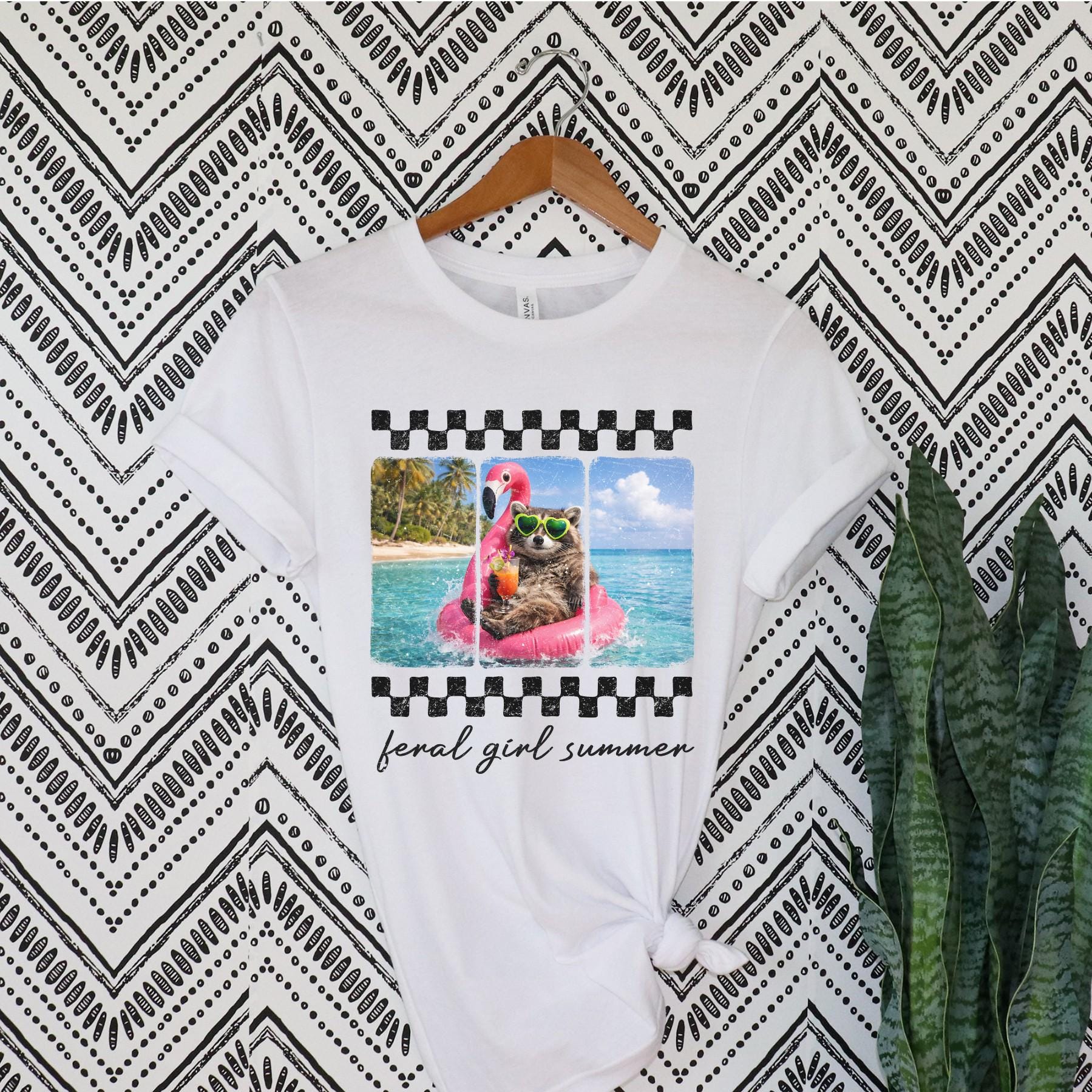 Our “Feral Girl Summer” tee is made for pool days, beach trips, and living your best carefree life. Featuring a playful raccoon lounging on a flamingo float with a drink in hand, this design brings the ultimate mix of humor and summer vibes.