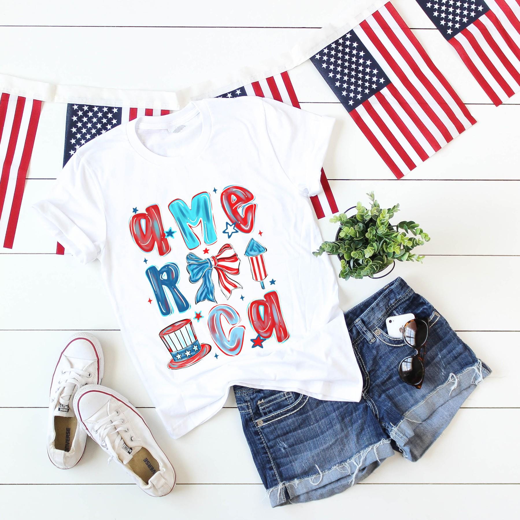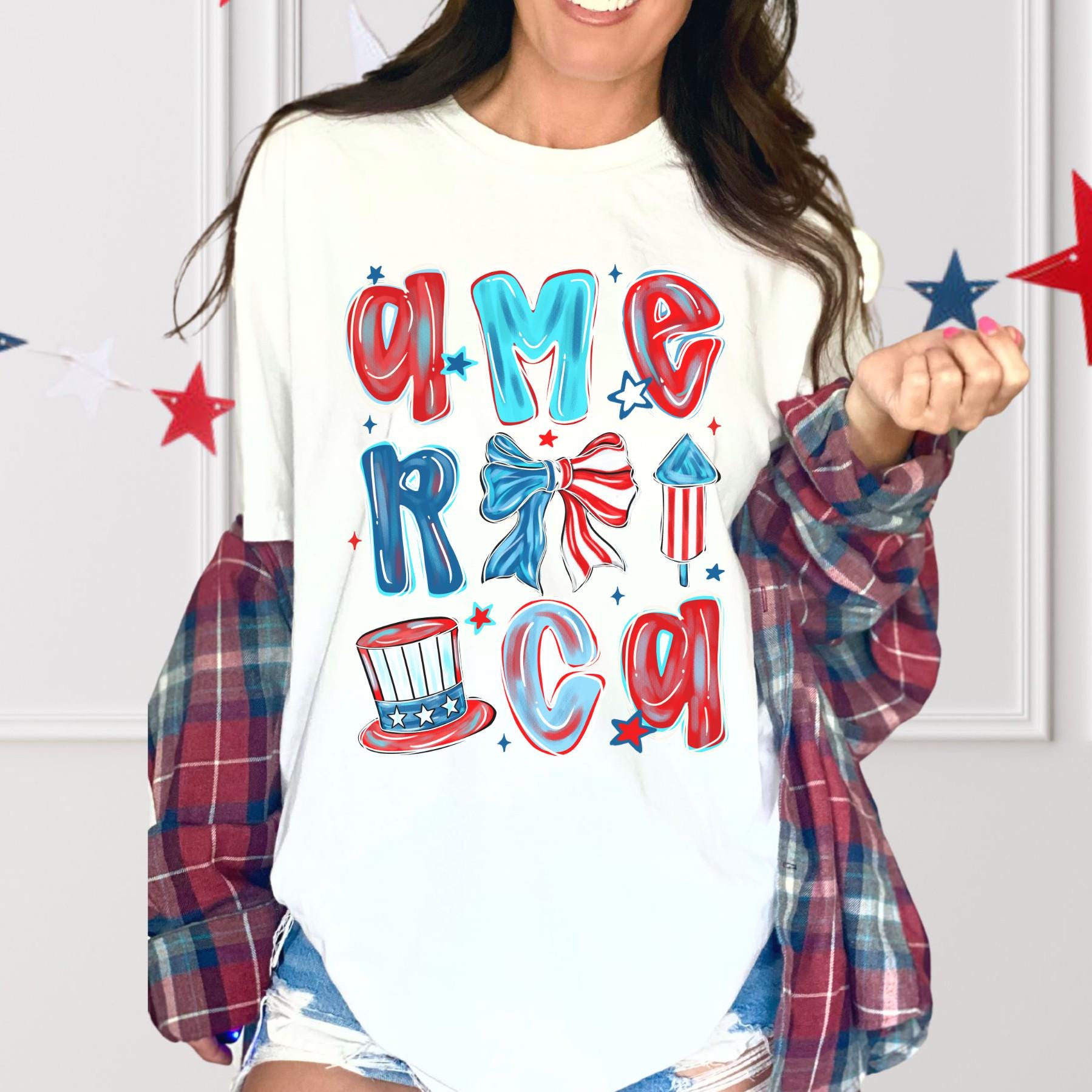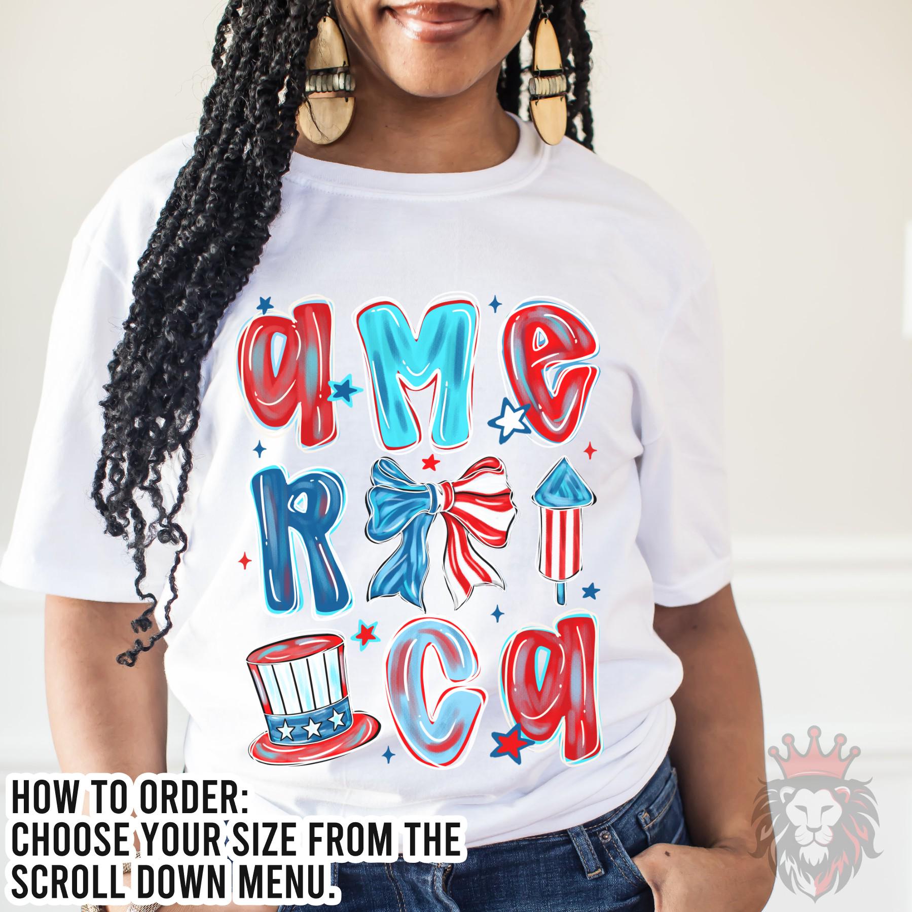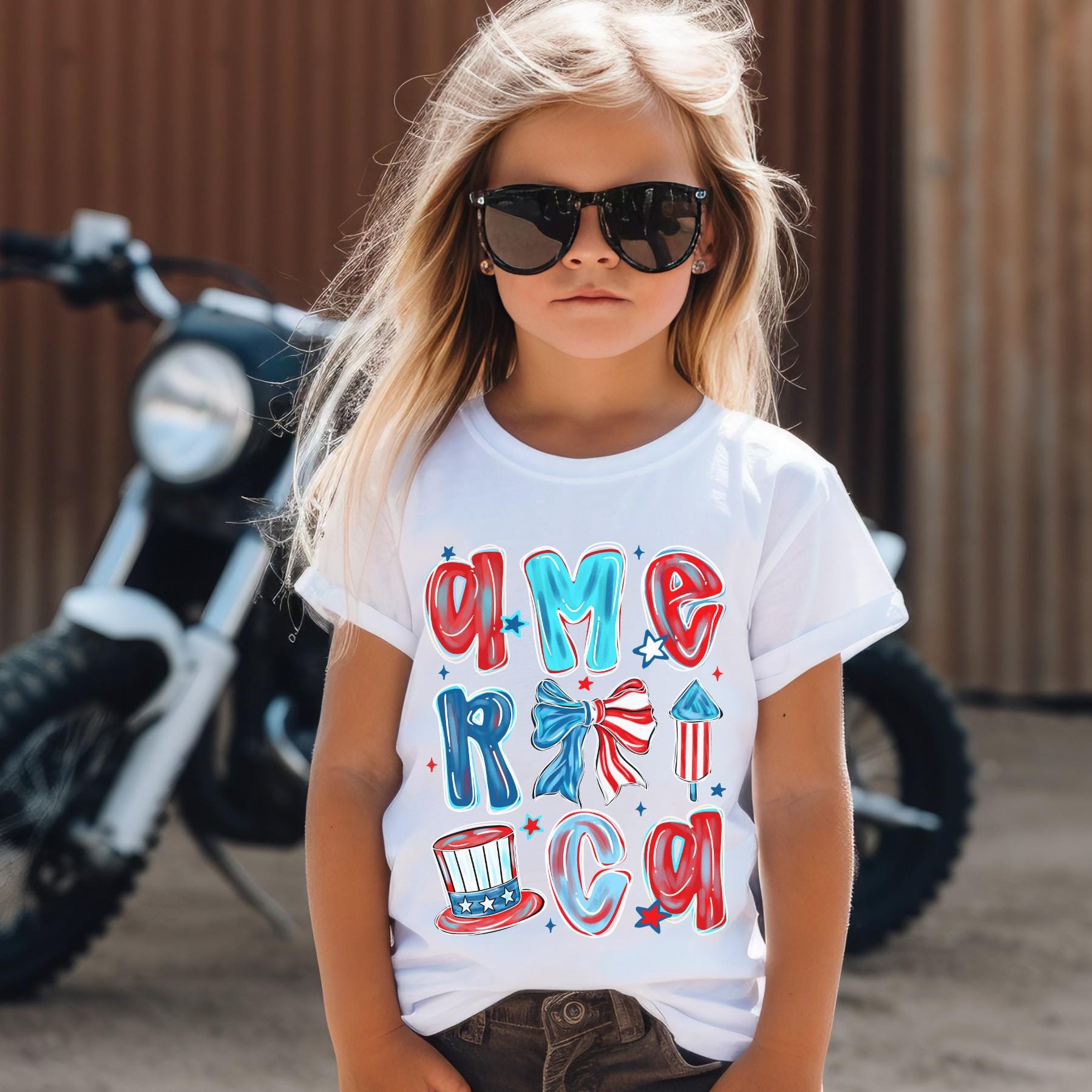 Celebrate in style with this cute and playful “America” bow shirt USA 🎀