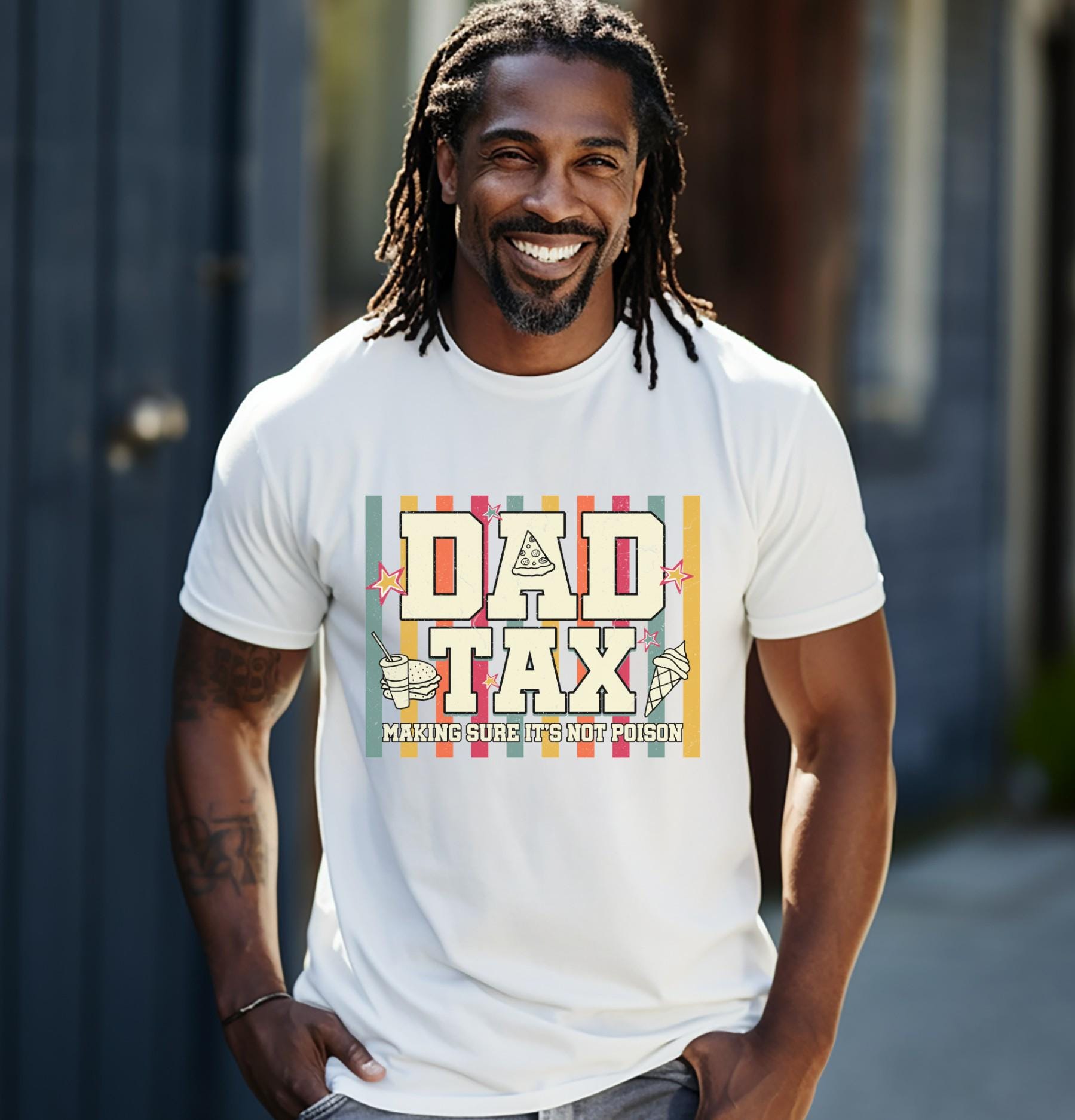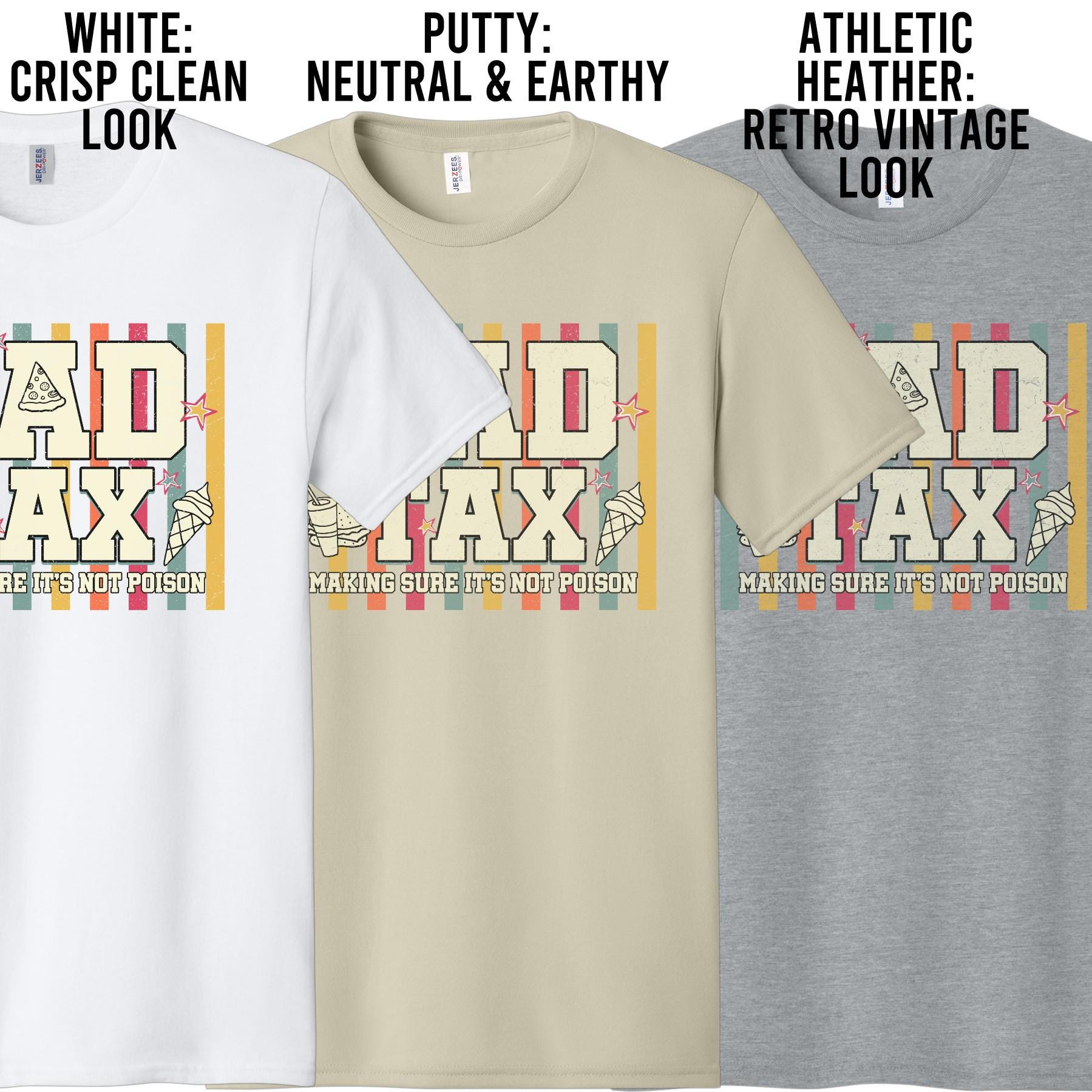 This funny “Dad Tax” shirt is perfect for dads who always claim a bite, sip, or snack—just to make sure it’s “not poison.” Featuring a bold, retro-style design with playful food icons, this tee is made for everyday laughs and laid-back style.