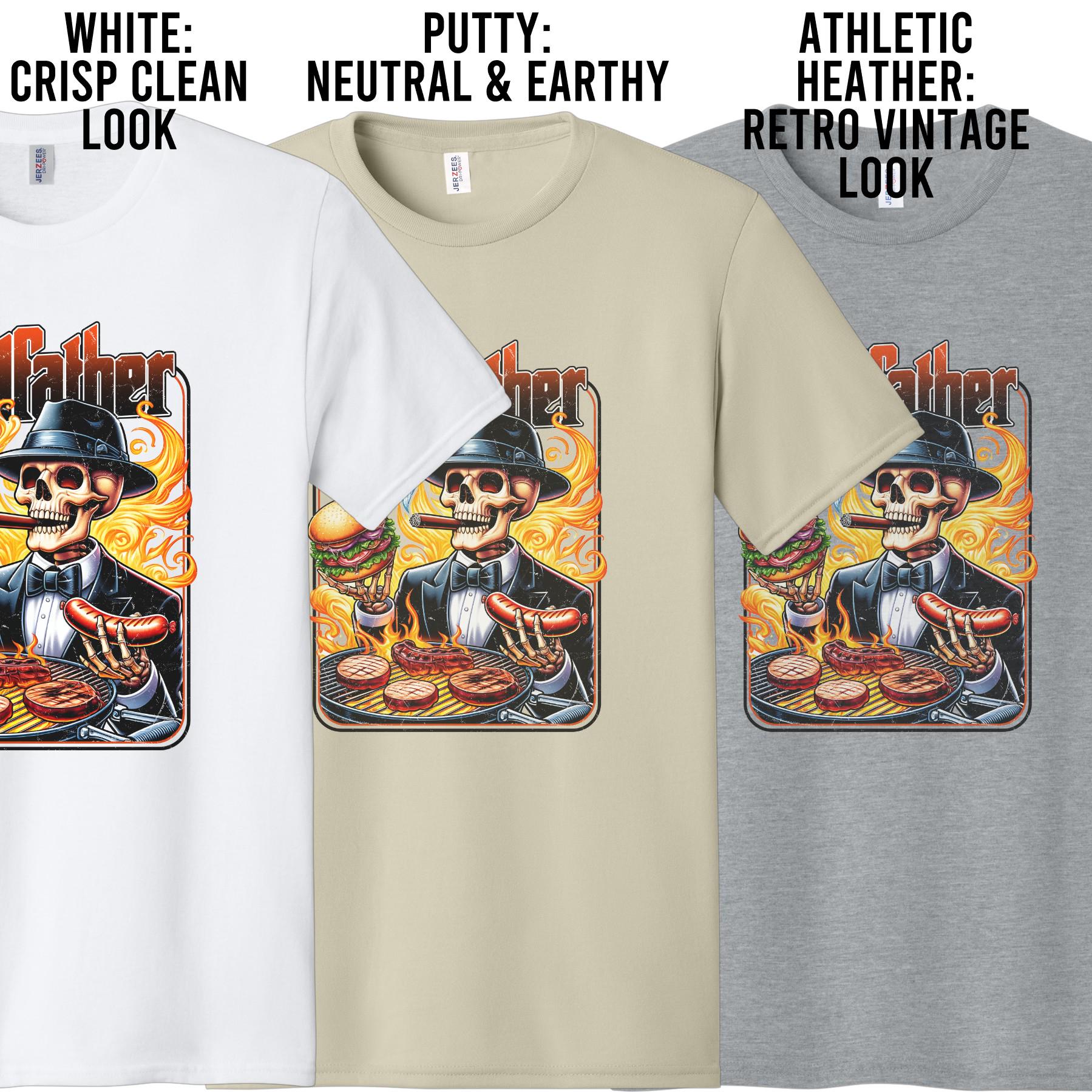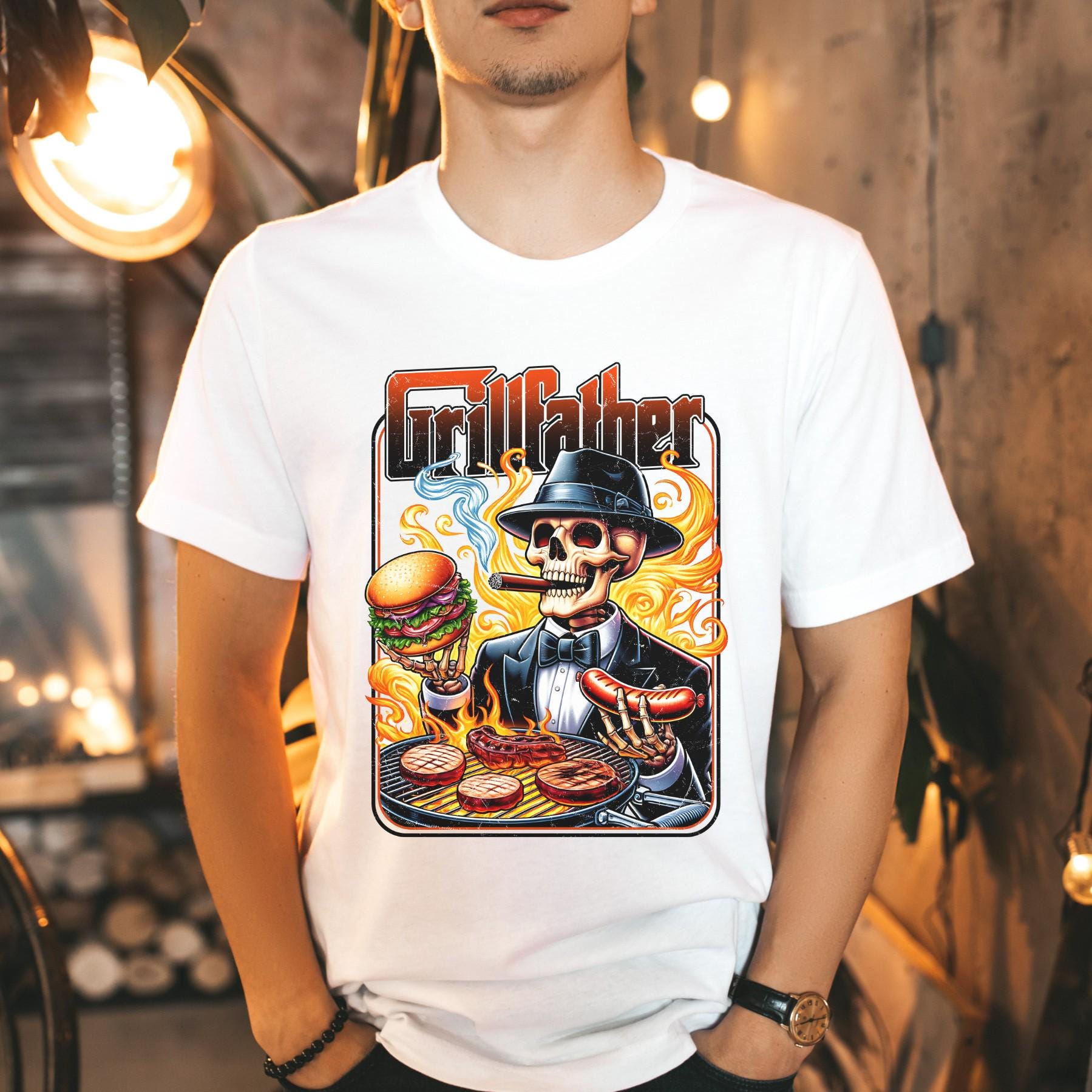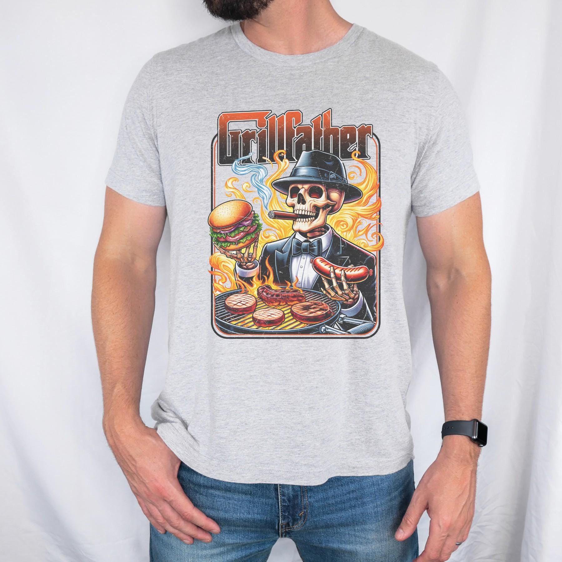 This bold “Grill Father” shirt is made for the king of backyard BBQ. Featuring a detailed, edgy graphic with a grilling skeleton and flame-filled design, this tee brings humor and attitude to every cookout.