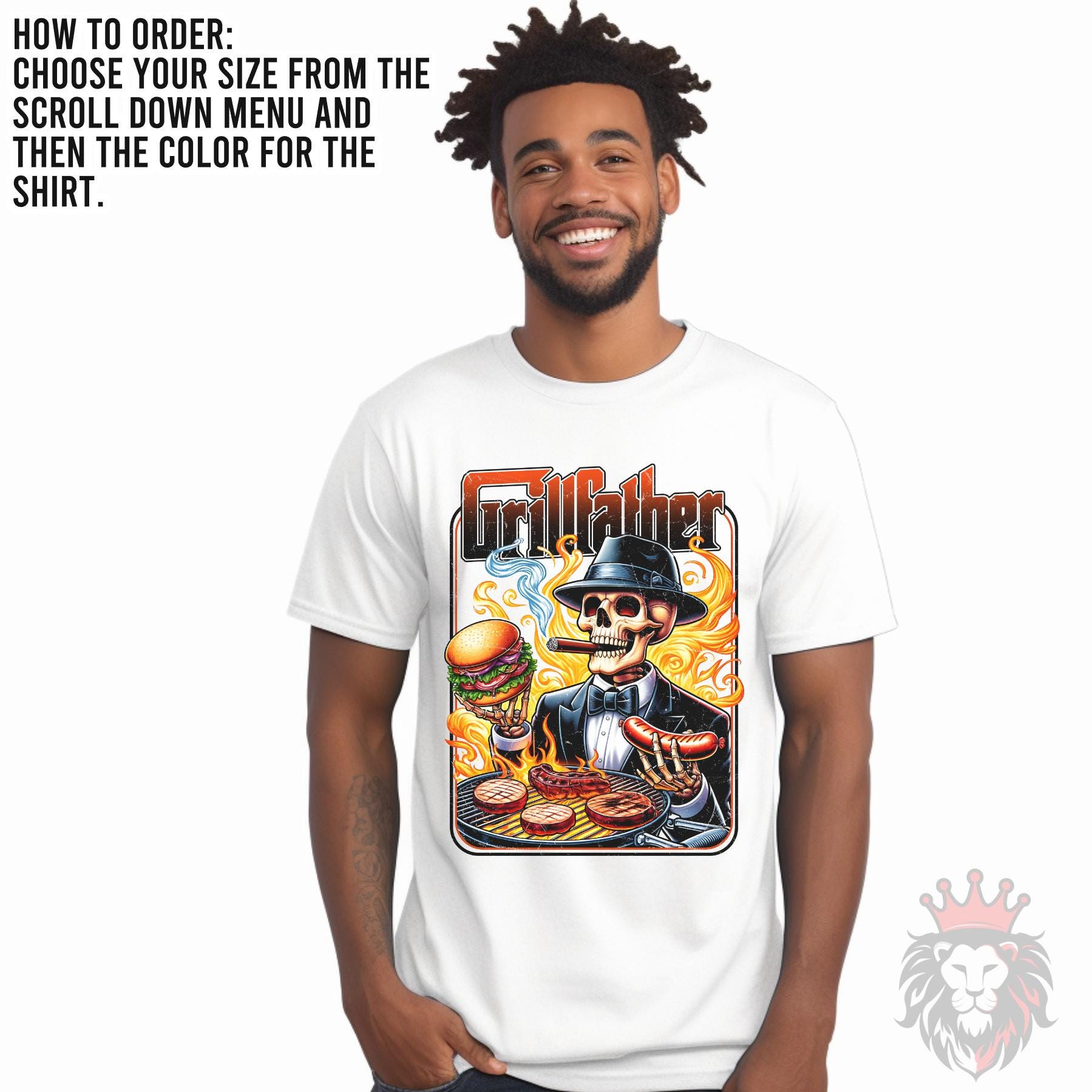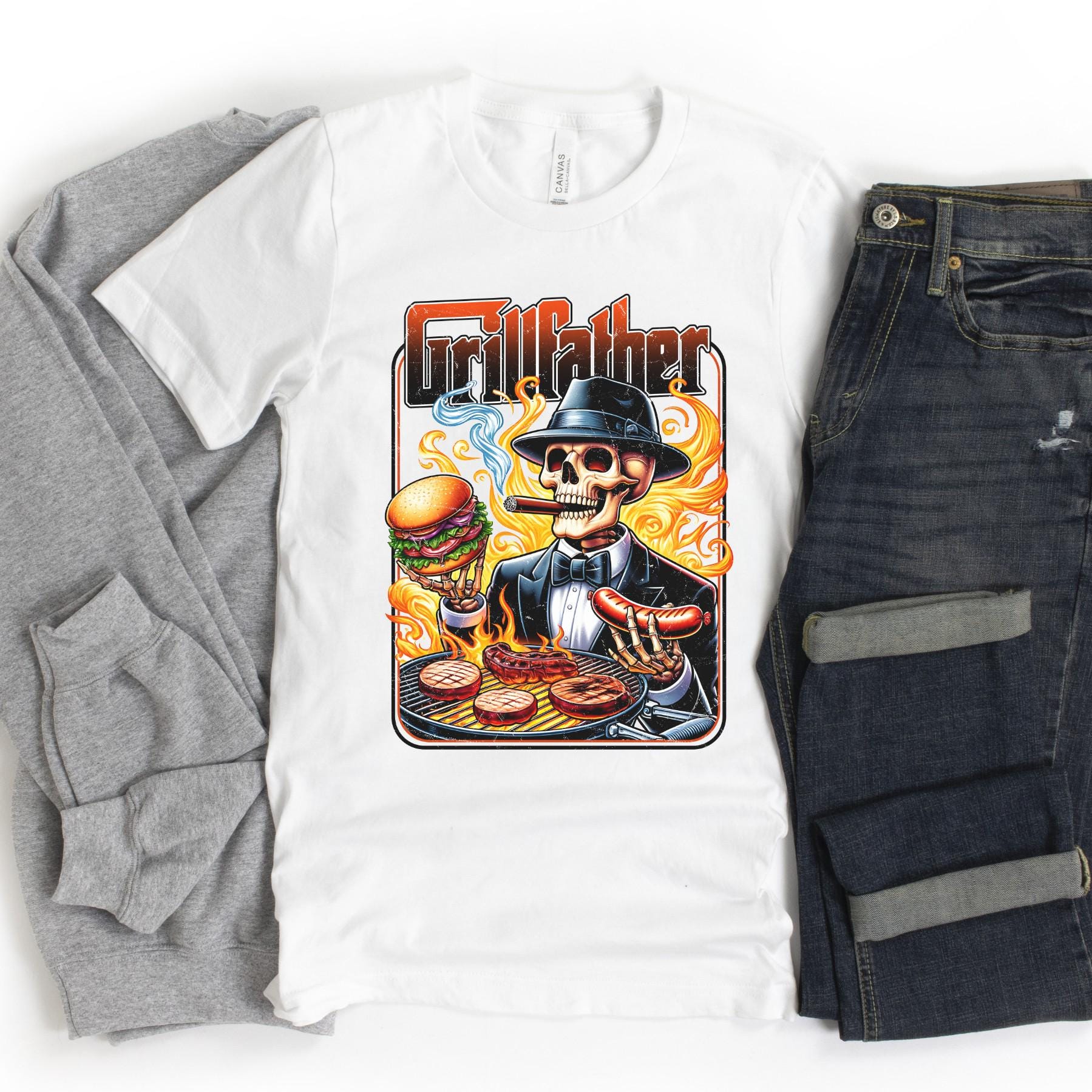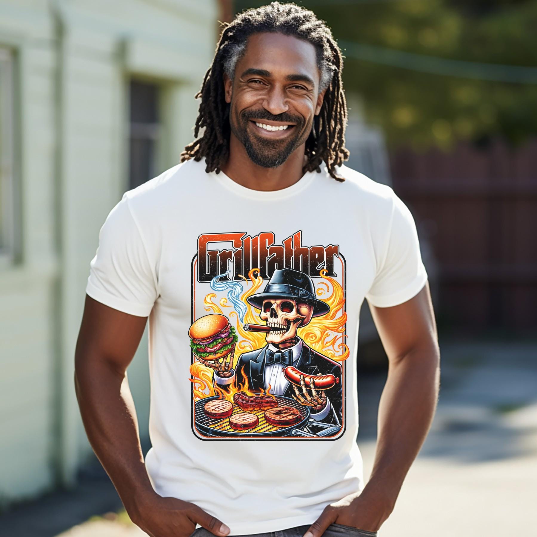 This bold “Grill Father” shirt is made for the king of backyard BBQ. Featuring a detailed, edgy graphic with a grilling skeleton and flame-filled design, this tee brings humor and attitude to every cookout.