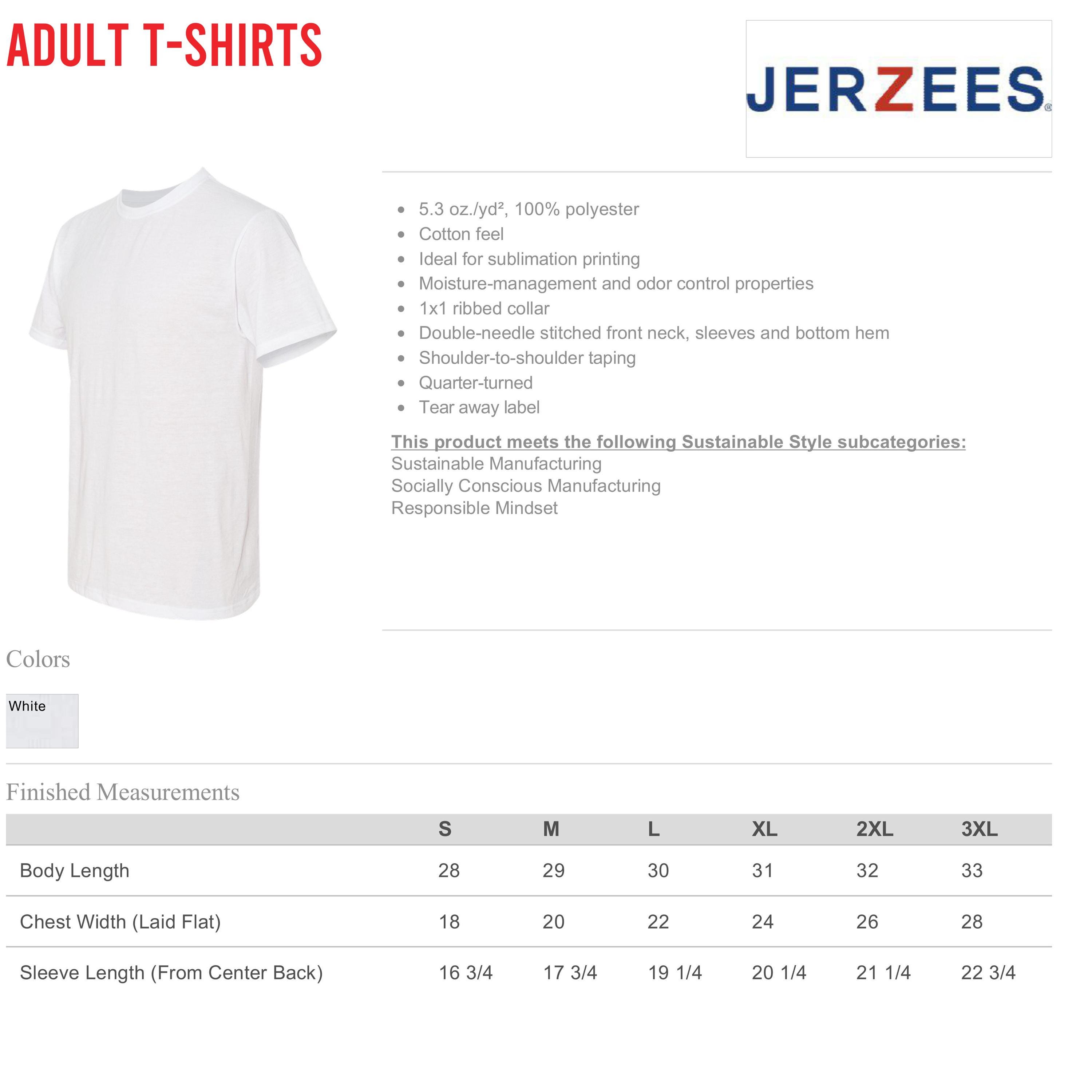 This design is SUBLIMATED using commercial equipment; areas, where there is white is NOT printed, so when ordering a colored shirt remember the shirt color will show through where there is no color (or what you think is white). Colors may differ from what you see on your screen. Please understand I do my best to accurately describe colors and place pictures for reference. The shirt is a mock-up. CARE INSTRUCTIONS: Machine or Hand Wash with like colors, no bleach. Lay flat to dry or machine dry on delicate. Do not Dry Clean. Do not iron. Please contact me if you need help filling out the forms. I'm here to help.