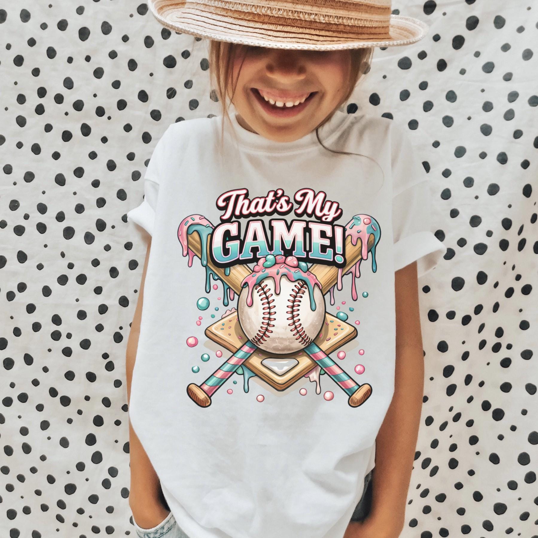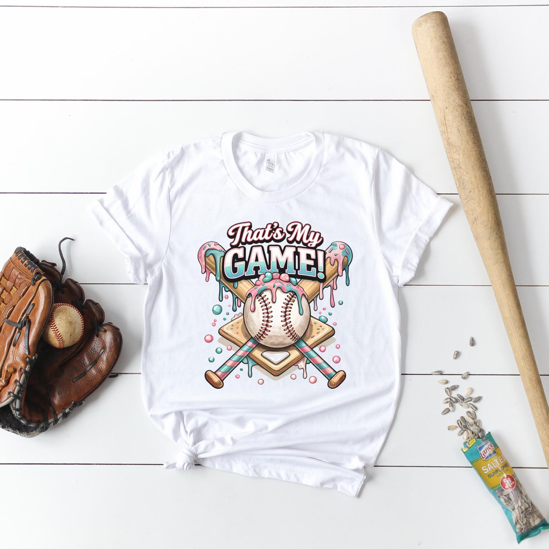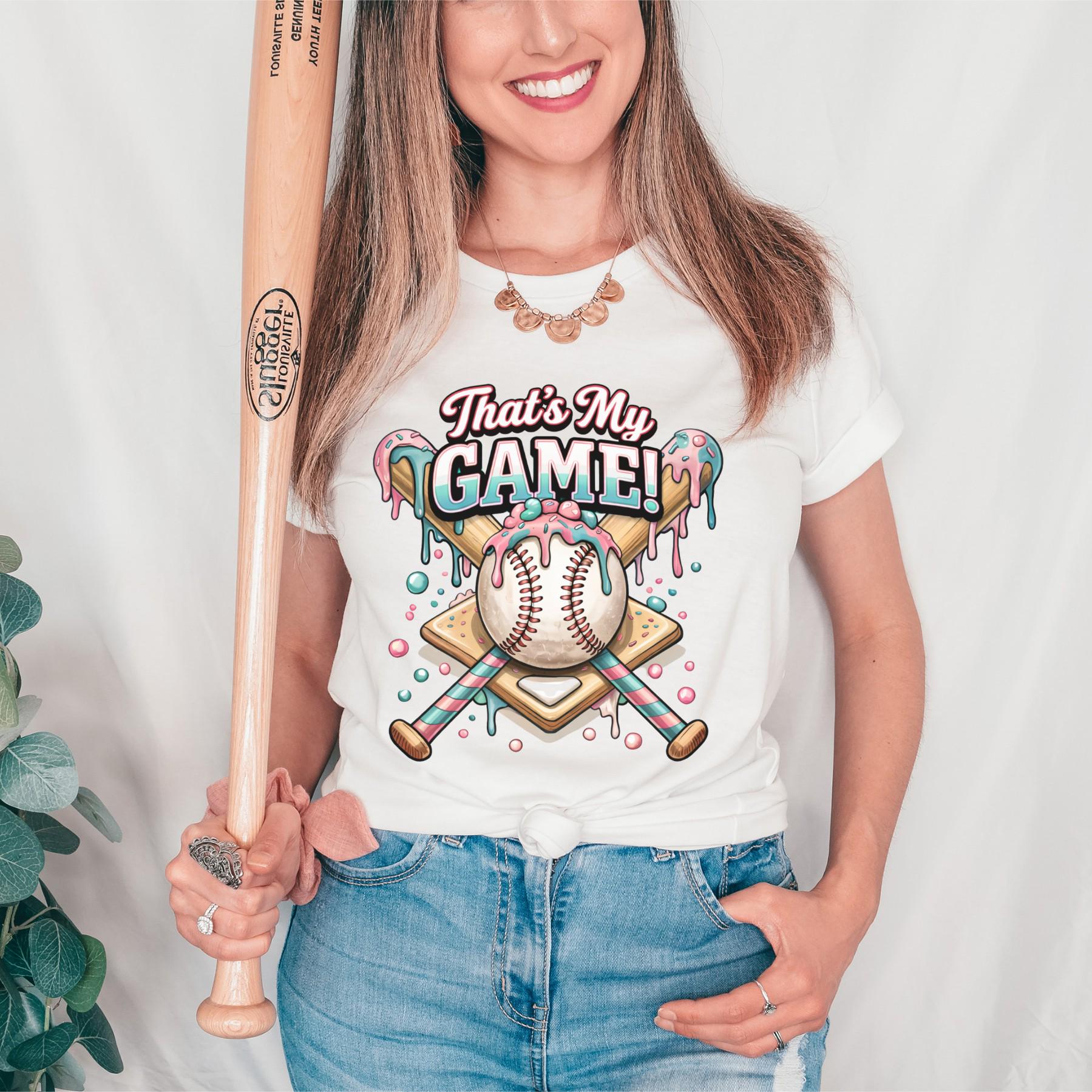 This “That’s My Game!” baseball shirt features a bold, playful design with dripping pastel details and crossed bats for a fun, trendy twist on classic baseball style. It’s perfect for players, fans, and sports moms who love standing out at the ballpark.